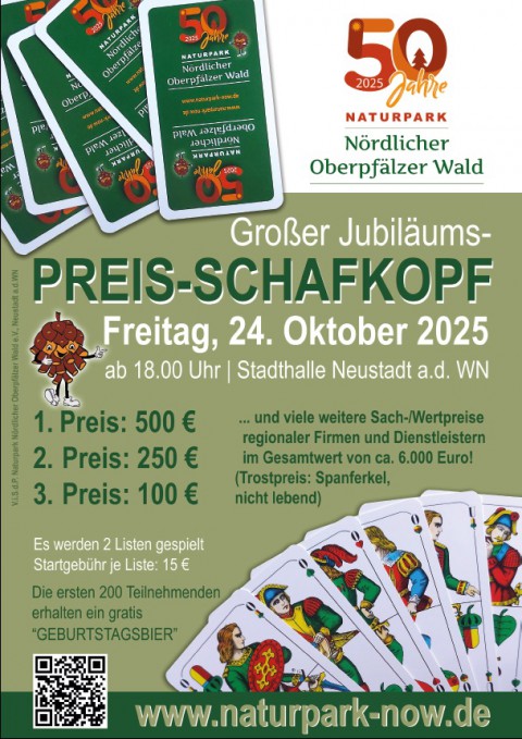50 Jahre Naturpark Oberpfälzer Wald - Großer Jubiläums-Preis-Schafkopf Wann: Freitag, 24.10.2025 ab 18:00 Uhr Wo: Stadthalle Neustadt a.d....